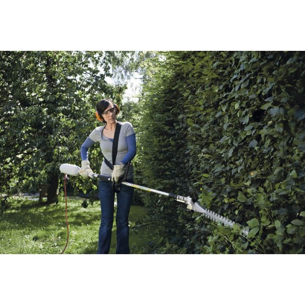 Puissant taille-haie sur perche électrique en version longue. Cet appareil permet de tailler sans difficultés et en toute sécurité depuis le sol des haies très hautes ou particulièrement larges. La possibilité de pouvoir orienter l’outil de coupe sur 125° en fait un outil à usage très polyvalent. Vous avez ainsi facilement accès en toute sécurité au sommet de la haie, tout en économisant du temps et des efforts.